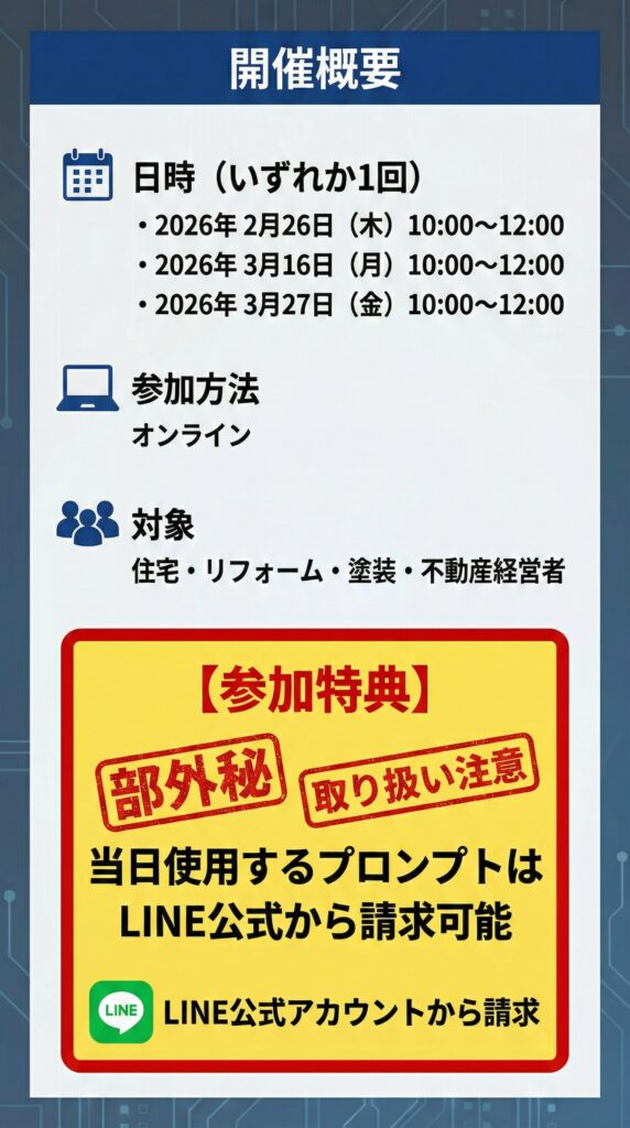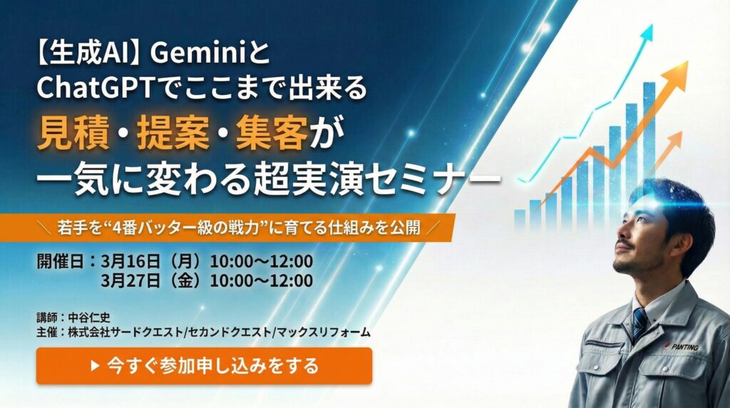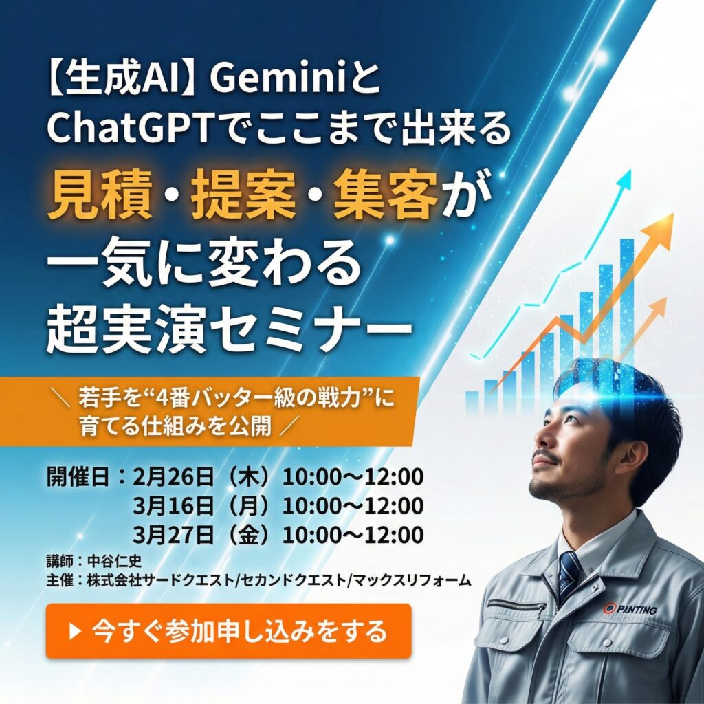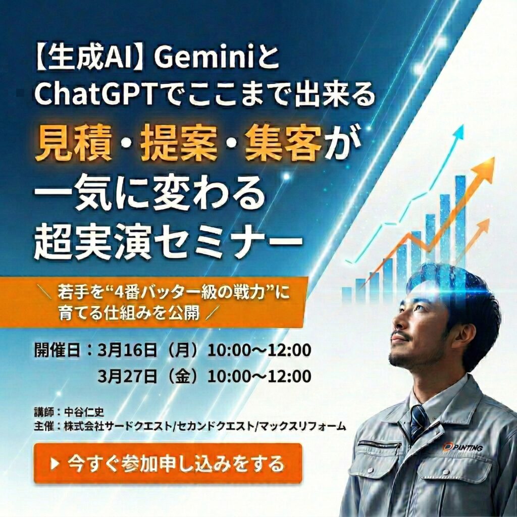 【経営者限定セミナー】GeminiとChatGPTでココまで出来る 見積・提案・集客が一気に変わる超実演セミナー開催日 2026年3月16日(月) 3月27日(金) 2026 3/06 セミナー 2026年2月16日2026年3月6日 この図面とパースGeminiで作りました! セミナー セミナー開催 外壁塗装のお客様は一体どこへ行ったのか 〜Google検索数激減時代の集客の考え方〜 関連記事 セミナー開催 外壁塗装のお客様は一体どこへ行ったのか 〜Google検索数激減時代の集客の考え方〜開催日 2026年3月19日(木) 2026年1月31日 ChatGPTだけでは戦えない!【Googleの逆襲】住宅業界を変えるGemini活用セミナー 開催日 2026年3月26日(木) 4月6日(月) 5月11日(月) 2025年12月21日 【参加無料】住宅業界を襲うAIOの衝撃とその対策を全公開セミナー 2026年3月24日(火)4月20日(月)開催開催日 2026年3月24日(火)4月20日(月) 2025年7月9日