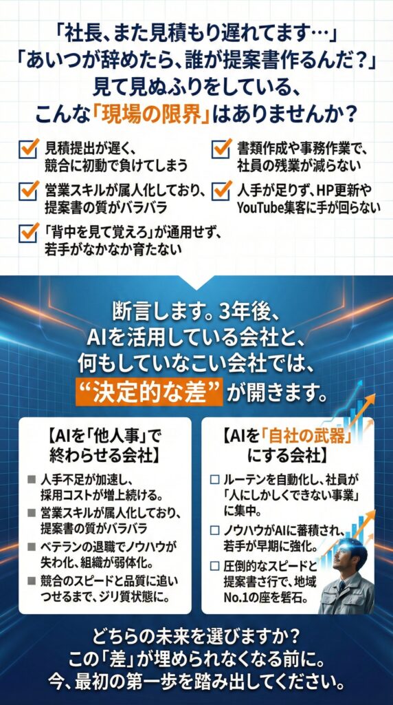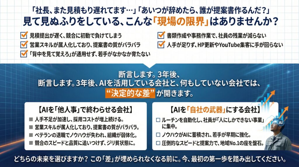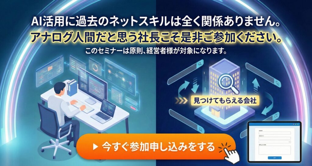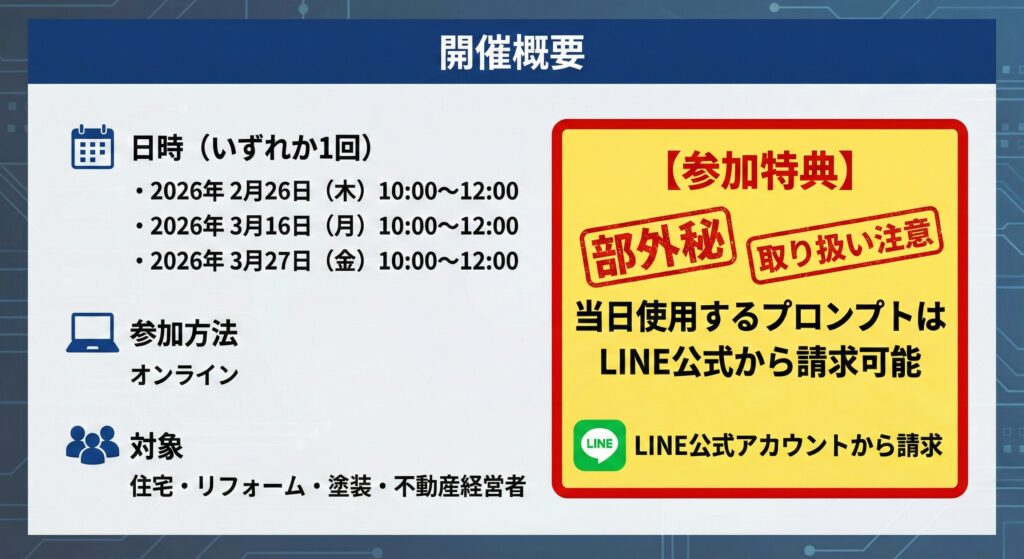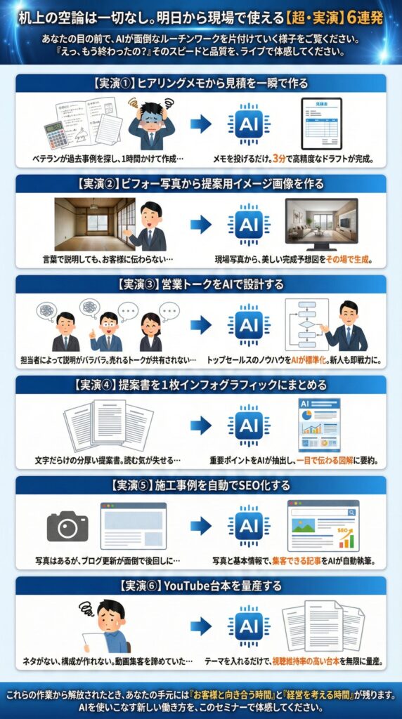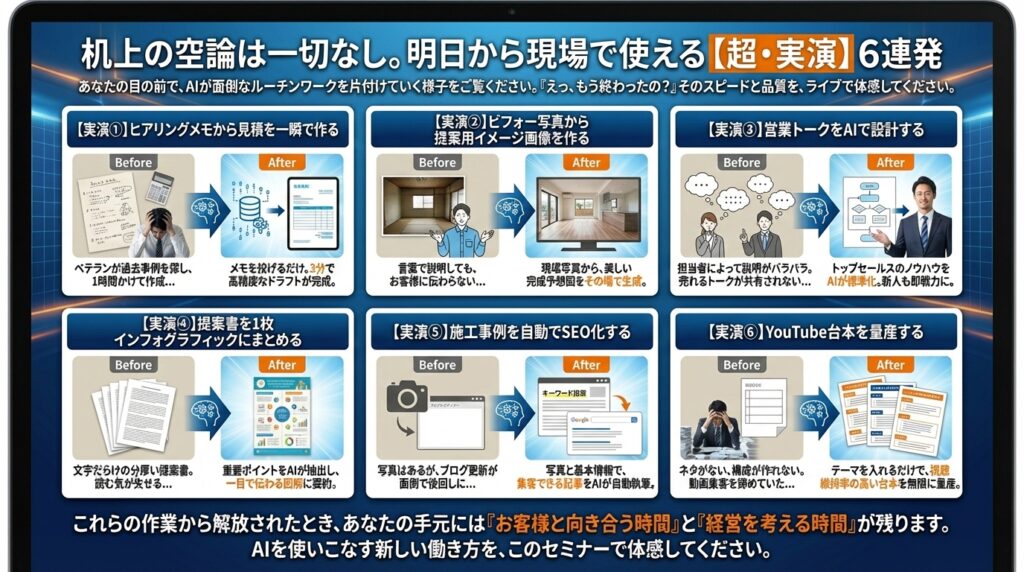 【経営者限定セミナー】GeminiとChatGPTでココまで出来る 見積・提案・集客が一気に変わる超実演セミナー開催日 2026年3月16日(月) 3月27日(金) 2026 3/06 セミナー 2026年2月16日2026年3月6日 この図面とパースGeminiで作りました! セミナー セミナー開催 外壁塗装のお客様は一体どこへ行ったのか 〜Google検索数激減時代の集客の考え方〜 関連記事 セミナー開催 外壁塗装のお客様は一体どこへ行ったのか 〜Google検索数激減時代の集客の考え方〜開催日 2026年3月19日(木) 2026年1月31日 ChatGPTだけでは戦えない!【Googleの逆襲】住宅業界を変えるGemini活用セミナー 開催日 2026年3月26日(木) 4月6日(月) 5月11日(月) 2025年12月21日 【参加無料】住宅業界を襲うAIOの衝撃とその対策を全公開セミナー 2026年3月24日(火)4月20日(月)開催開催日 2026年3月24日(火)4月20日(月) 2025年7月9日